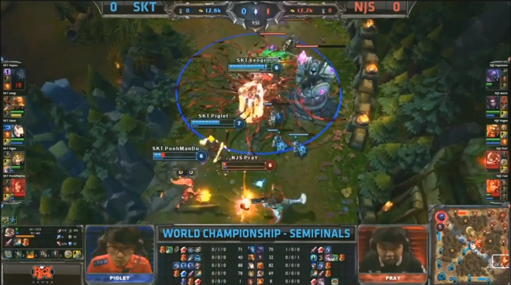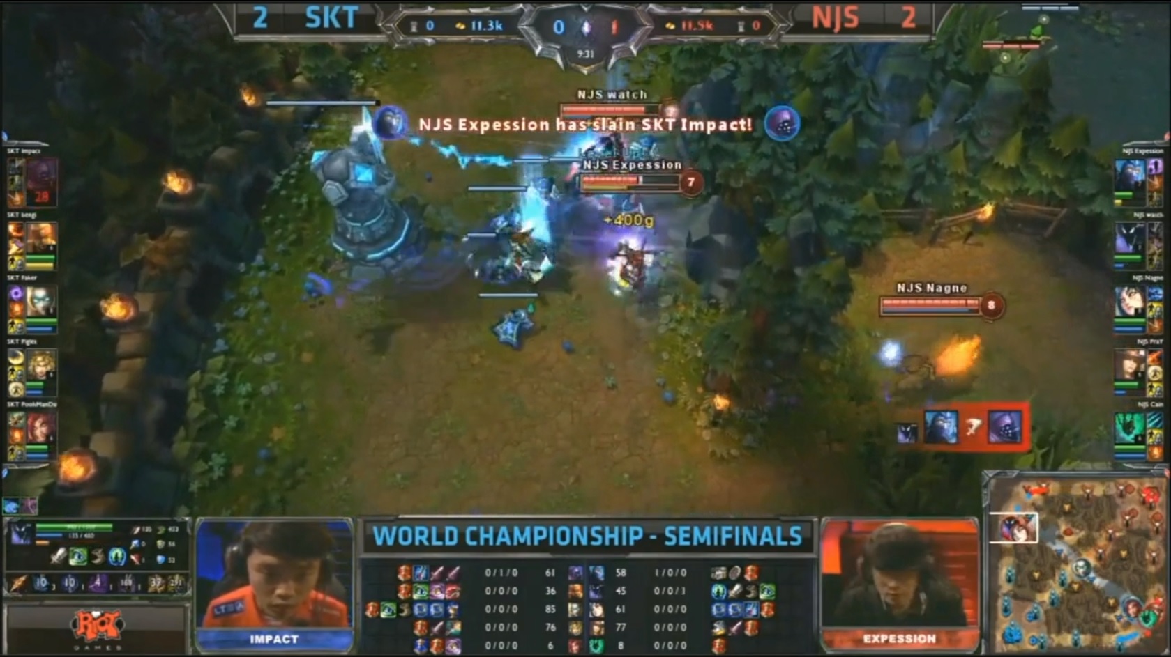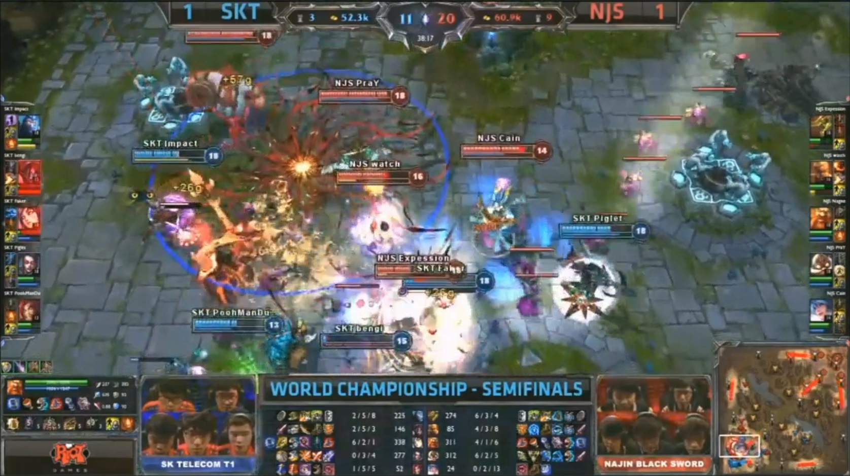 Cinquième et dernière game dans cette première demi-finale 100% coréenne. Celle-ci commence avec une invade du blue buff pas les SKT. Il faut attendre la 9e minute pour voir le firstblood pris par les NJS grâce à un bon décalage de Nocturne au top. Pendant ce temps, les SKT assurent le premier drake de la game. Le match reste serré entre les 2 équipes avec une égalité au niveau des golds.