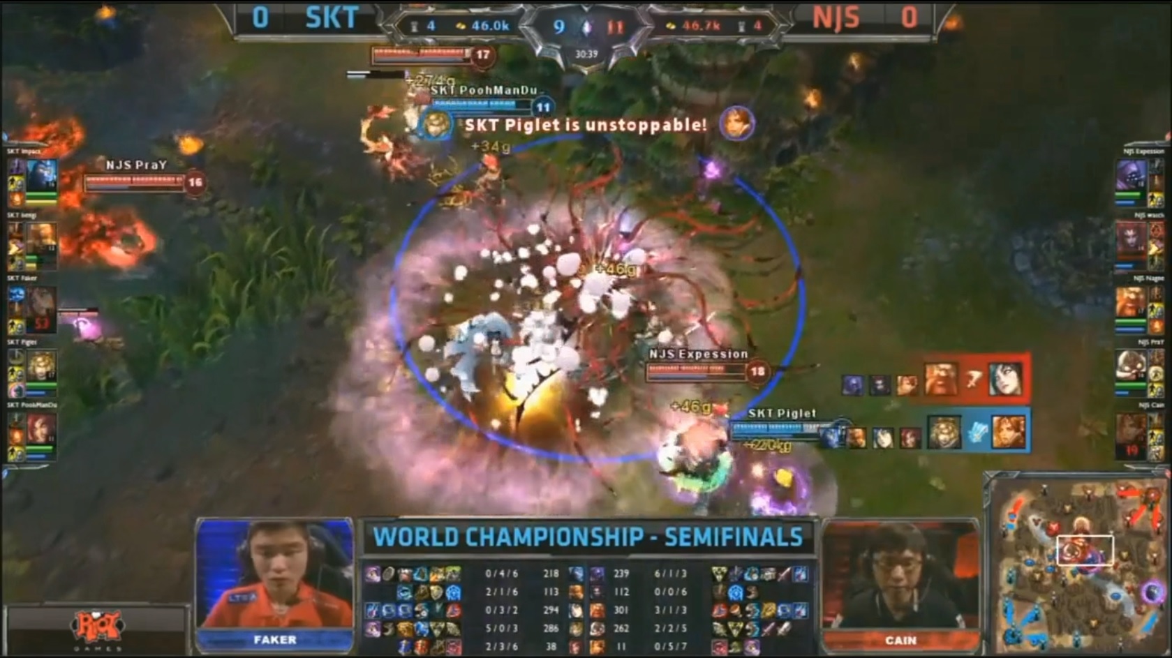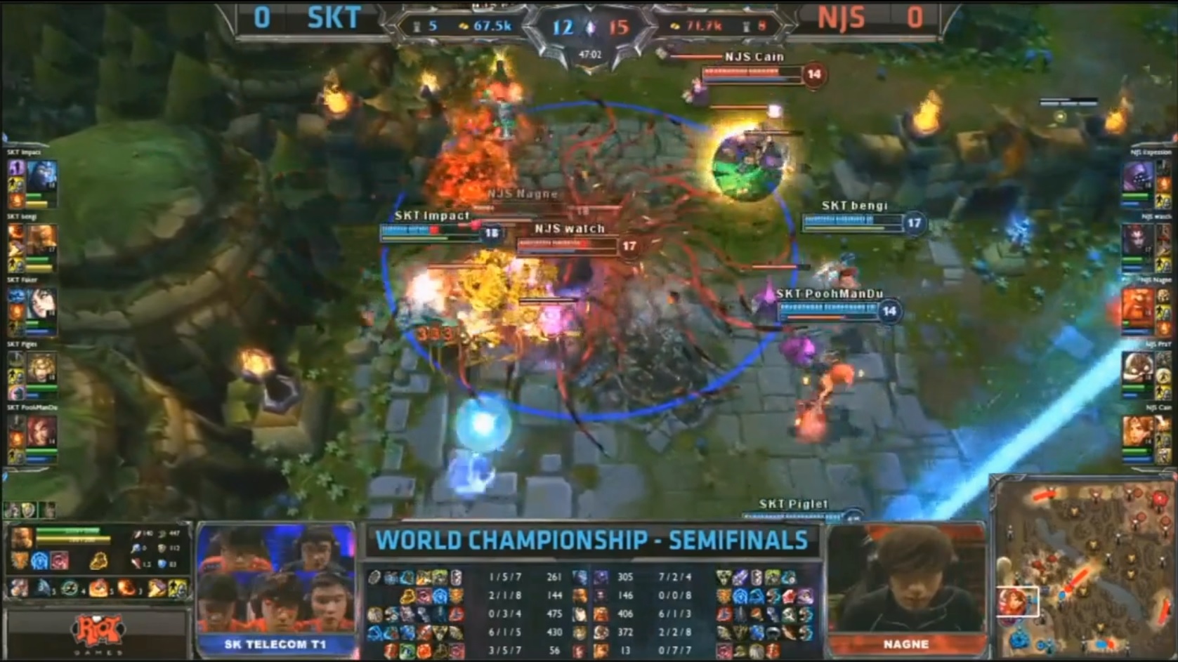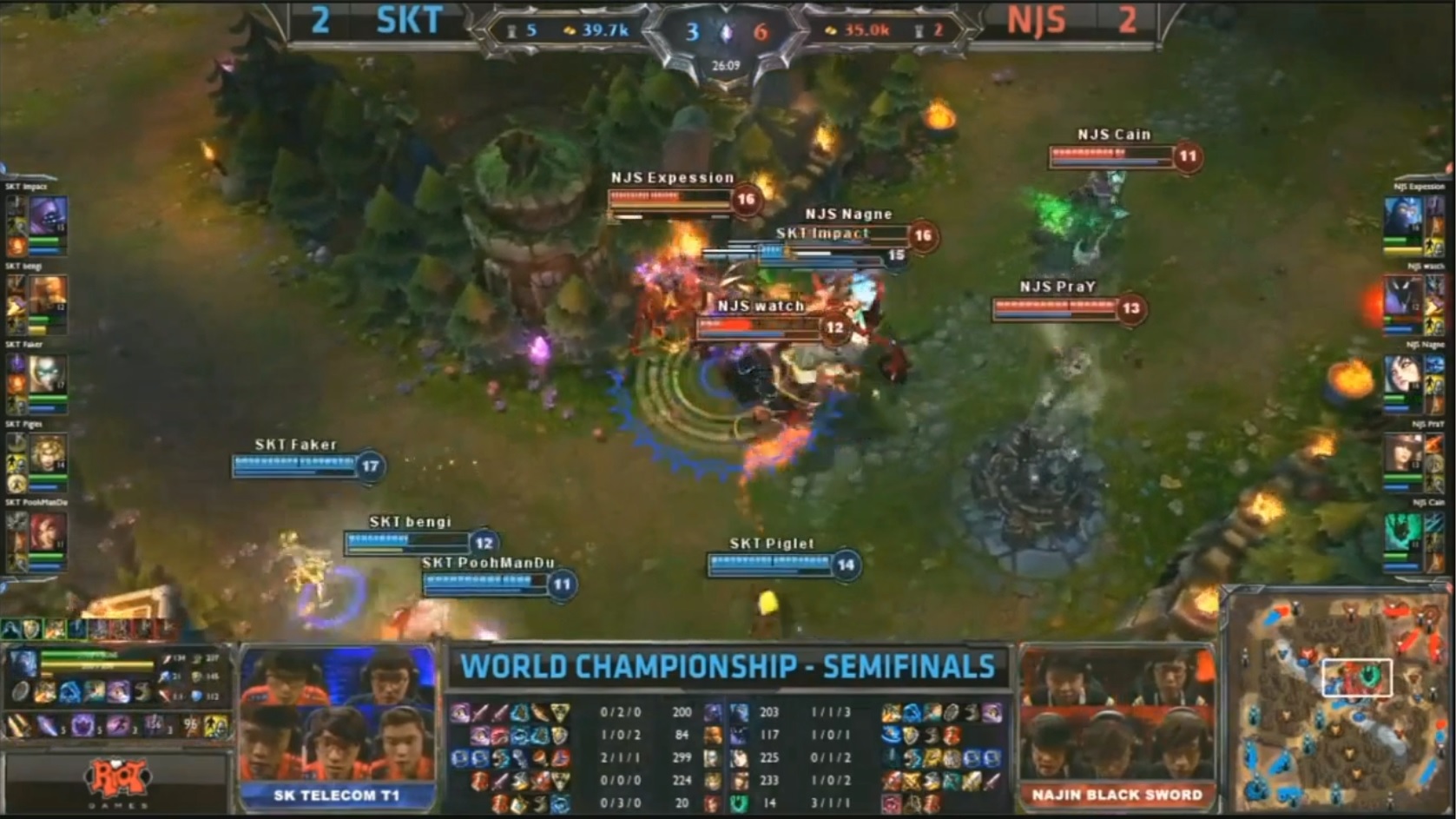 Nous arrivons à la 15e minute et les SKT dominent largement cette game avec une avance de 7k gold et 6 kills. Nous retrouvons les SKT devant l’antre du Baron pour une tentative sur le Nashor, mais celle-ci sera vite abandonnée suite à une réaction imortante des NJS. 24e minute, les SKT décalent au bot et engagent en teamfight. Ils prennent 3 kills, 2 tourelles et 1 inhibiteur. L’avance est dorénavant de 14k gold pour les SKT. Les SKT continuent à mettre la pression au mid et au top.