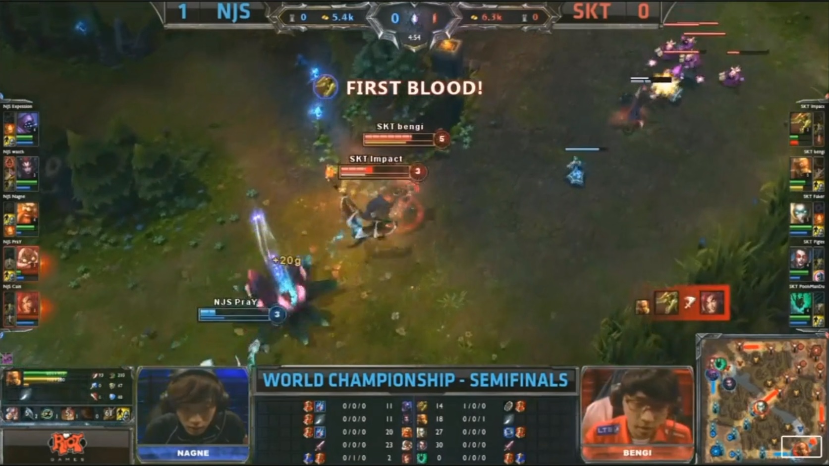 Première demi-finale entre les SKT T1 et les Najin Black Sword et cette première manche commence avec un double invade du blue buff des 2 équipes. Ça hard push sur la botlane et les SKT profitent du back de la duolane des NJS pour faire le premier drake de la partie dès la 7e minute. Il faut attendre la 10e minute pour assister au firstblood pour les NJS alors qu’au même moment, les SKT prennent leurs 2 premiers kills au bot.