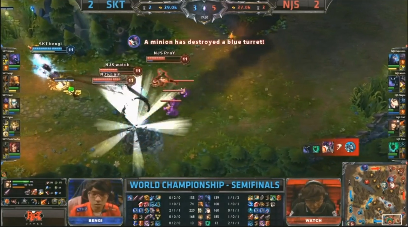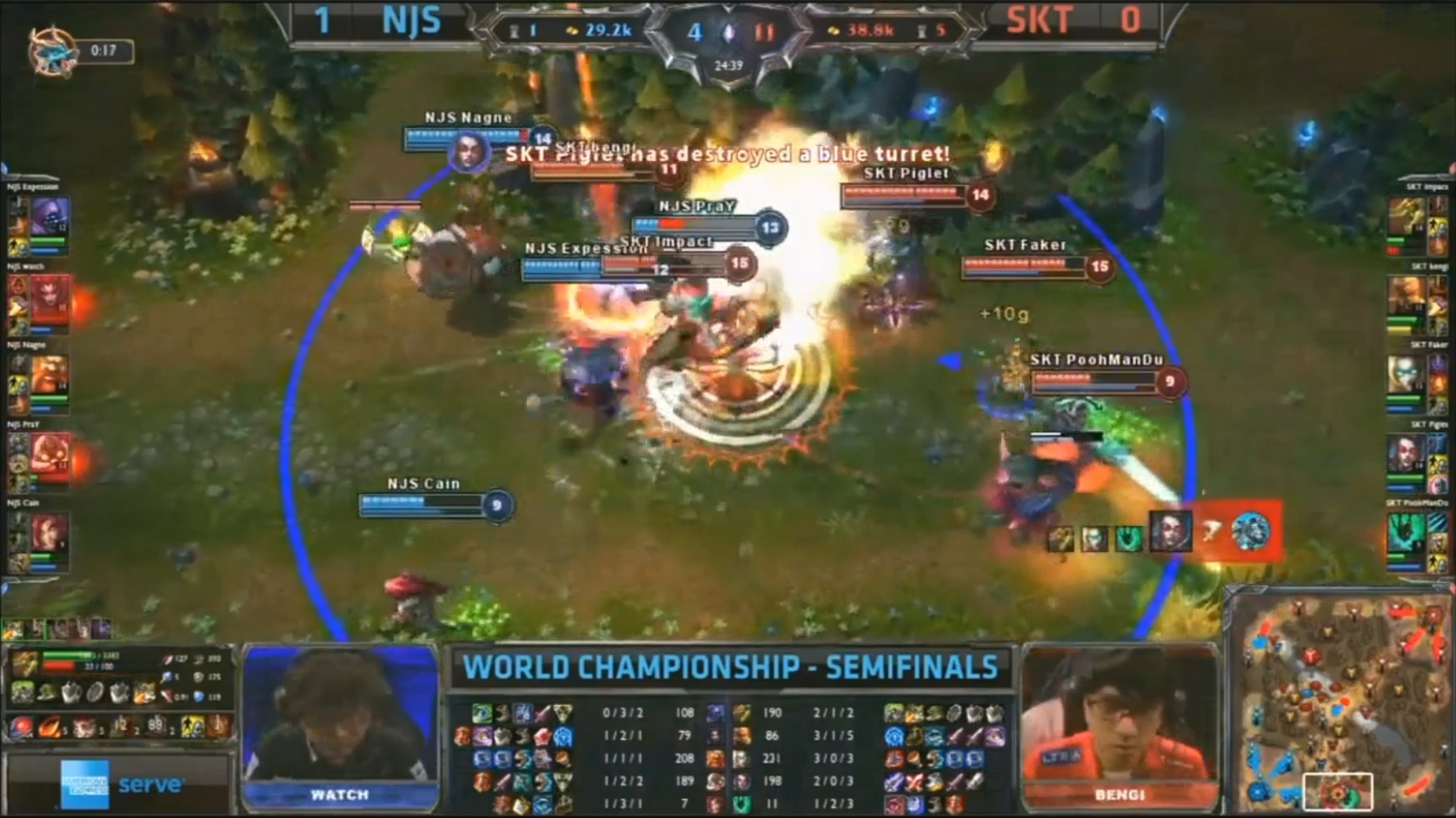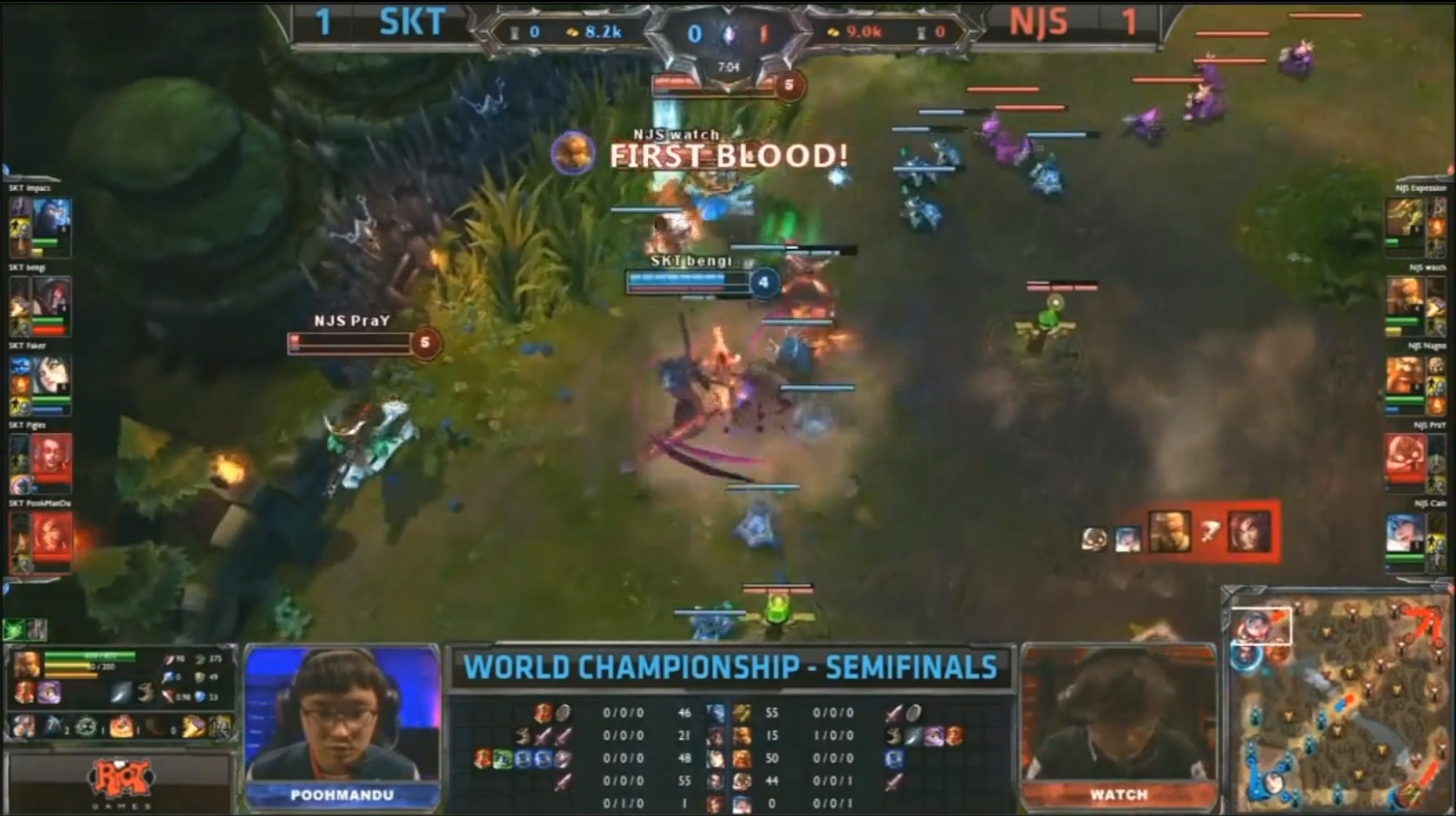 Début de la seconde game et les SKT swap leur duolane au top. 5e minute, les SKT prennent le firstblood au bot et enchaînent avec un second kill. Les SKT mettent une grosse de pression sur toutes les lanes dans cette game et évitent les erreurs commises dans la précédente. Les NJS enchaînent les erreurs de placements et les SKT en profitent pour récupérer des kills. La première tourelle du mid tombe à la 11e minute et les SKT décalent au top.