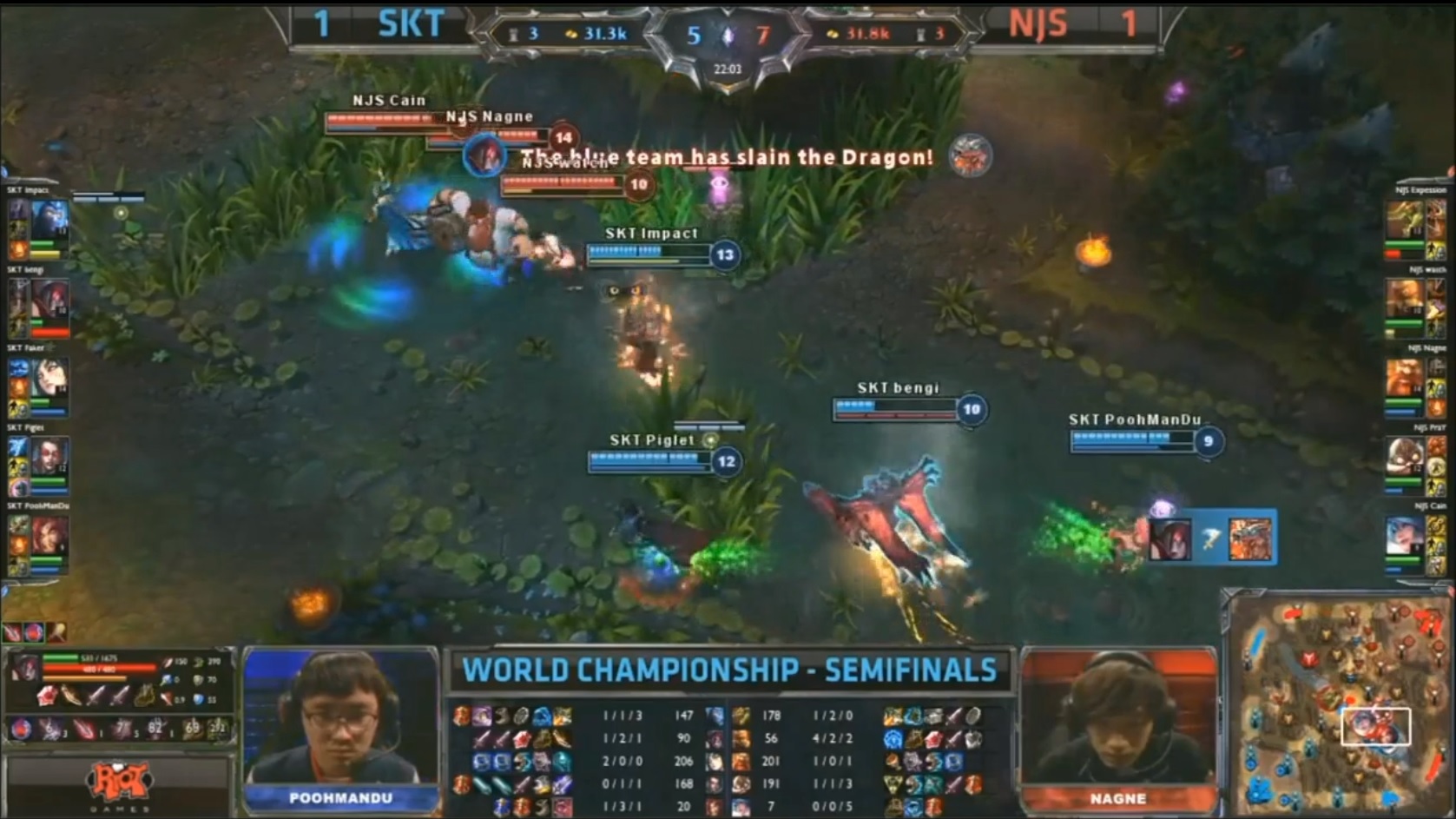 15e minute, les NJS prennent leur premier drake et les 2 équipes se retrouvent au coude à coude au niveau des golds. 21e minute, les SKT assurent un kill de drake, mais concèdent 1 kill suite à la réaction des NJS. 27e minute, les NJS reprennent l’avantage dans cette game avec une légère avance de 3k gold. Les NJS mettent la pression au bot, prennent 1 kill supplémentaire et 1 drake.