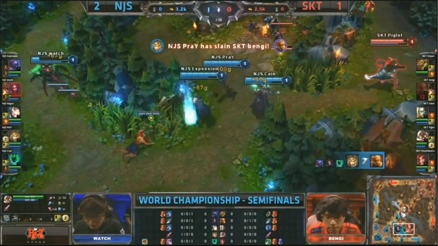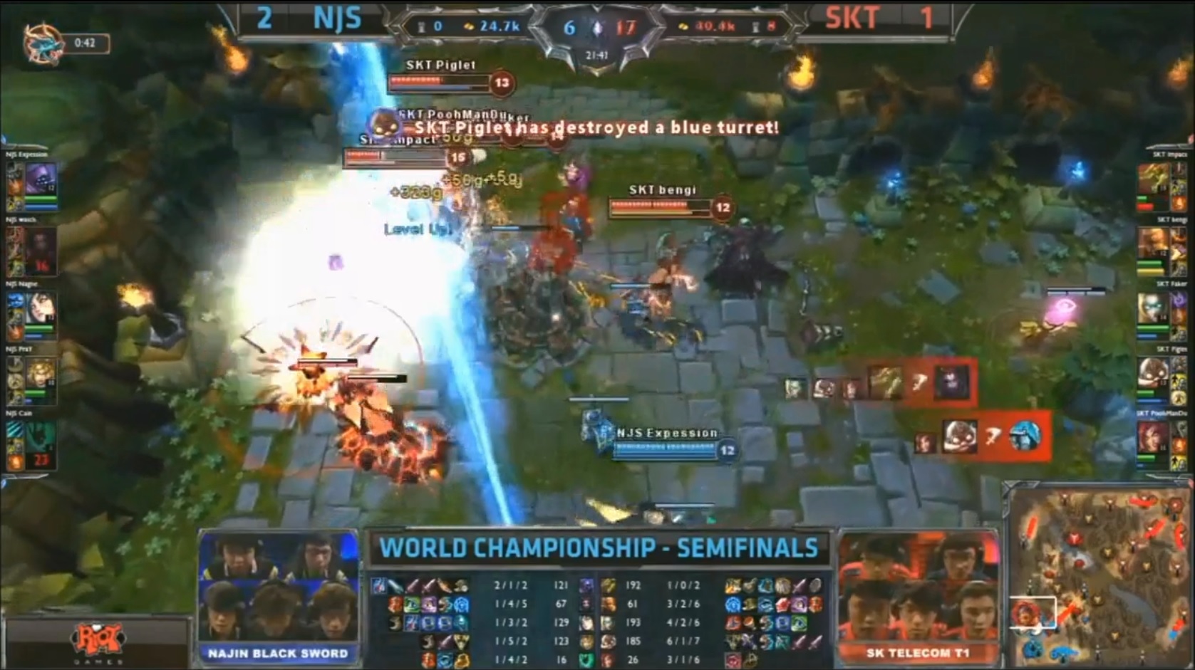 39e minute, les NJS prennent un free Nashor et commencent à assiéger la base des SKT avec la destruction du premier inhibiteur mid à la 42e minute ; le push des NJS continue maintenant sur la toplane et ils enchaînent sur un teamfight en leur faveur avec 3 kills de pris.
