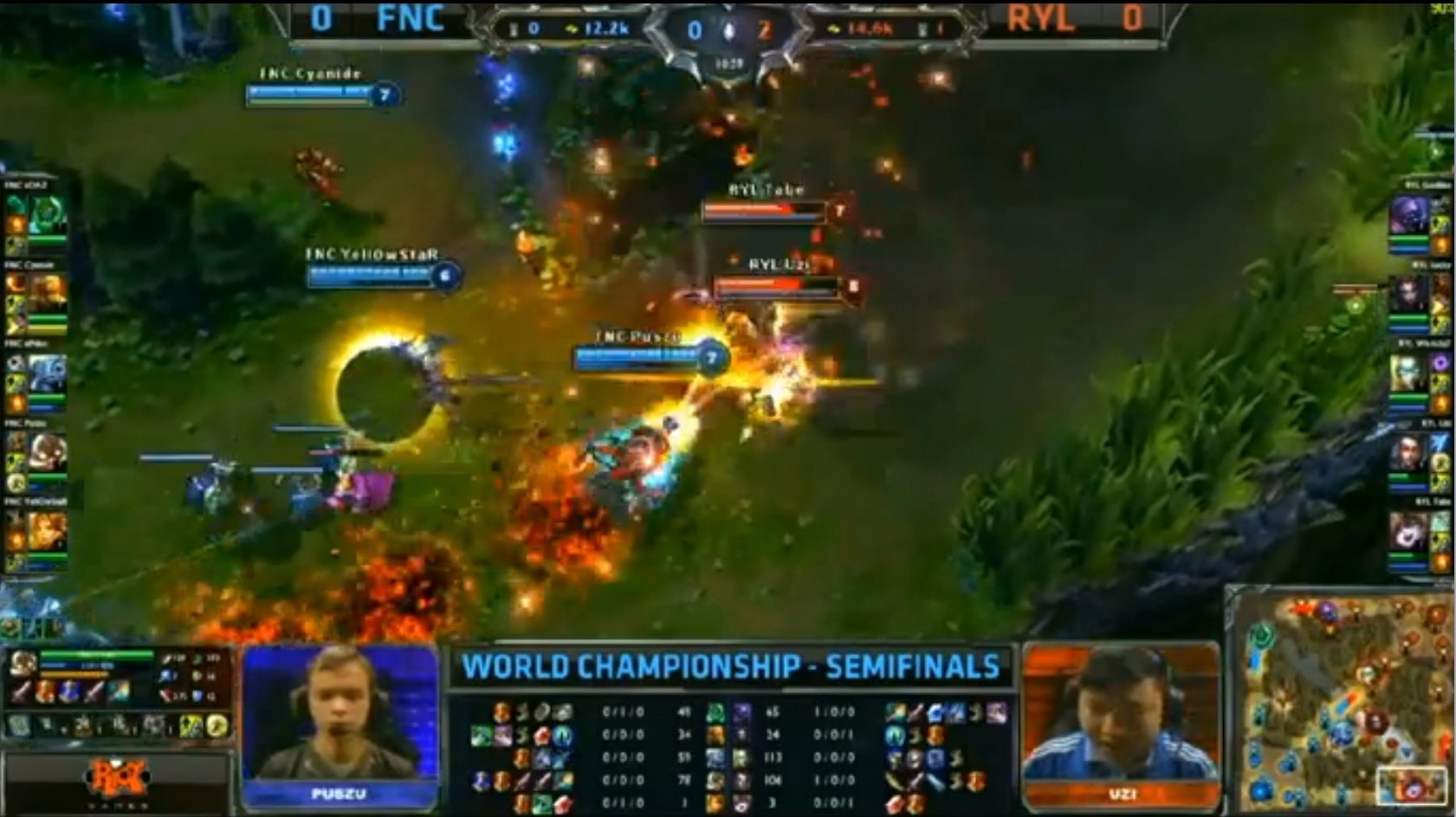 Cette game peut être fatidique pour les Fnatic s’ils ne la gagnent pas. C’est ainsi qu’à la 1ere minute les Fnatic tendent un piège aux RYL et cela permet aux Fnatic de prendre une avance malgré l’absence de Firstblood grâce aux sorts utilisés par l’équipe chinoise pour s’échapper. Les Fnatic veulent le Firstblood et font tout pour l’avoir en exécutant un gank sur Renekton à la 6e minute grâce au décalage de Zac, Orianna et Aatroc, au niveau du Drake. Cela laisse libre cours au Fnatic de réaliser le dragon.