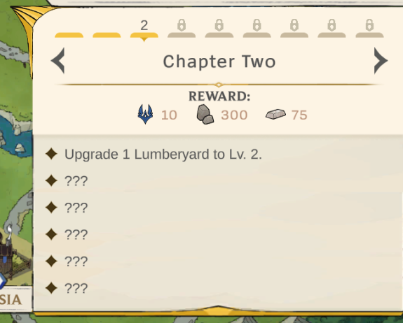 À tout moment, vous pouvez cliquer sur cet objectif pour consulter tous les objectifs que vous avez accomplis, ainsi que les récompenses que vous obtiendrez en terminant ce chapitre de l’histoire.