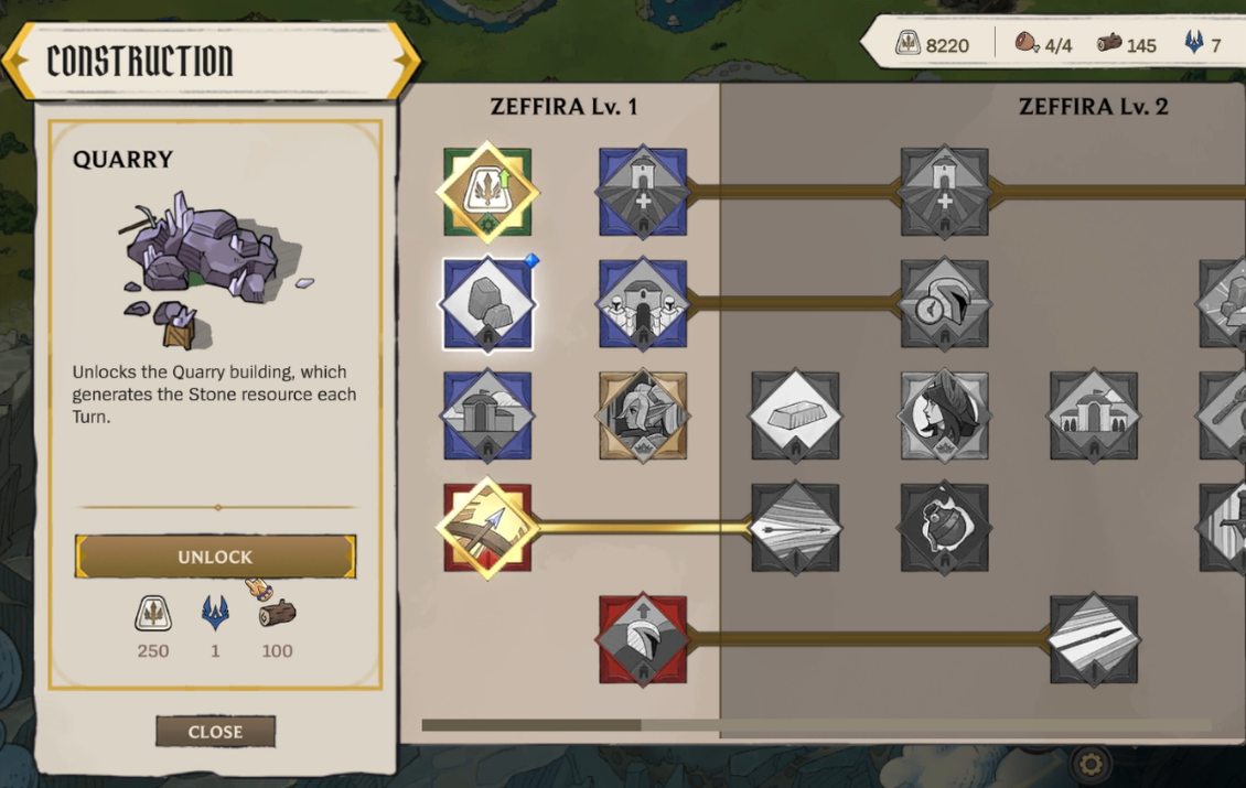 Dans le panneau de recherche, vous verrez de nombreuses améliorations, classées par niveau et par couleur. Les objets de recherche sont répartis en fonction du niveau de votre ville principale, Zeffira. Déverrouiller des sections supplémentaires de l’arbre de recherche nécessite d’améliorer Zeffira. Ces options de recherche gagnent en puissance à mesure que vous progressez dans le jeu.