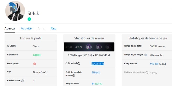 Pour grimper en niveau sur Steam ce n'est pas aussi facile qu'on pourrait le penser, et bien souvent d'ailleurs il faut même payer. Quand la majorité des joueurs ne savent même pas quelle expérience ils possèdent, d'autres se battent pour obtenir le plus de récompenses et être au sommet de la pyramide mondiale. C'est notamment le cas de ce fameux St4ck qui est aujourd'hui le premier à avoir atteint le niveau 5000. Possédant désormais 4736 jeux, pour 16 200 heures passées au total à jouer sur la plateforme de Valve, ce joueur qui serait originaire du Qatar semble tout simplement être devenu un collectionneur compulsif.