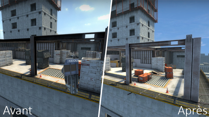 Le plus gros des changements intervient essentiellement sur le site B de vertigo. Celui-ci a été complètement changé pour être plus ouvert, mais avec des accès plus restreints. On y voit notamment la suppression de la fenêtre, la suppression d’obstacle pour se cacher, mais l’ajout d’autres accès, plus éloigné de la zone de plante.