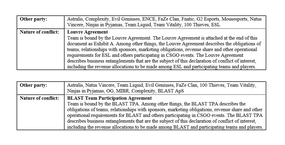 Exemple d’une déclaration de conflits d’intérêts (ici G2 Esports)