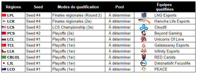 *Ces équipes peuvent encore obtenir un meilleur seed en fonction de leurs résultats pendant des playoffs (ou finales régionales).