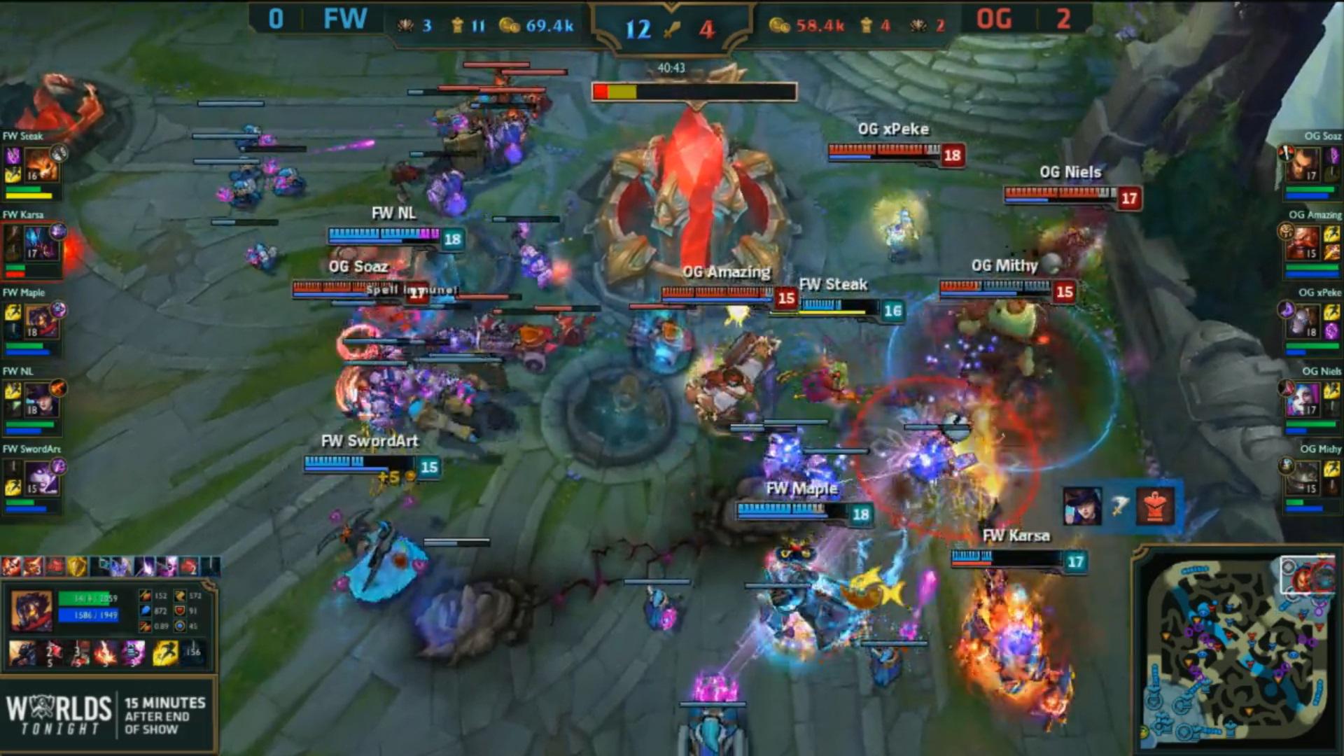 Les OG reprennent le contrôle de la partie et remettent le push de lane en place, mais les FW n’ont pas dit leurs derniers mots et arrivent à faire bloc, empêchant leurs adversaires d’approcher. Les Origen prennent un second Nashor suivi d’un teamfight gagnant et entament un hard push au mid et au bot.